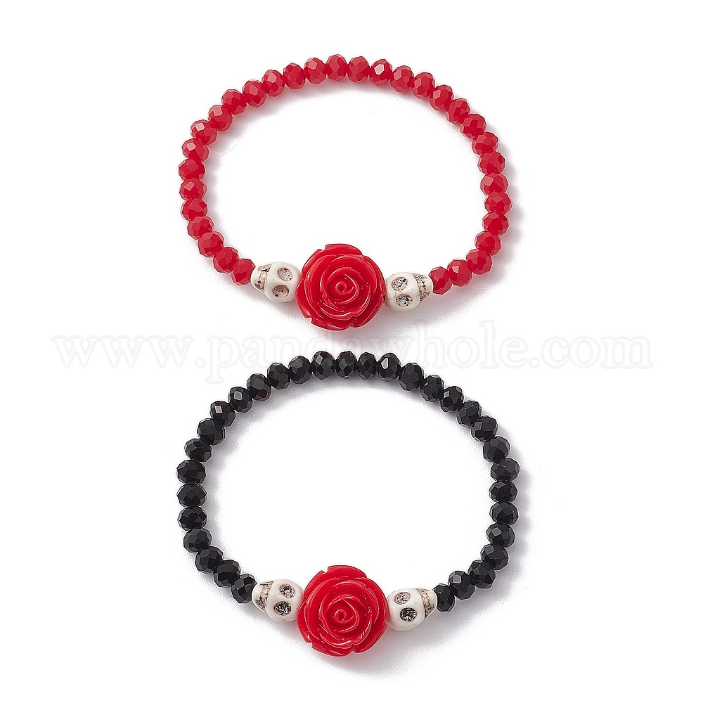 2 шт. 2 цвета, цветочные браслеты из смолы и граненого стекла, эластичные браслеты из бисера, Женские браслеты из синтетической бирюзы с черепом на Хэллоуин