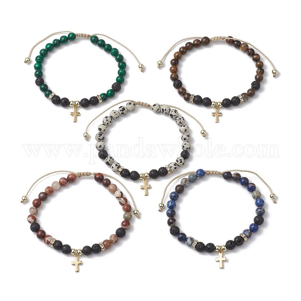6Браслеты из круглых бусин из смешанных драгоценных камней диаметром 7 мм, плетеные из бисера, регулируемые 304 браслеты с крошечным крестиком из нержавеющей стали