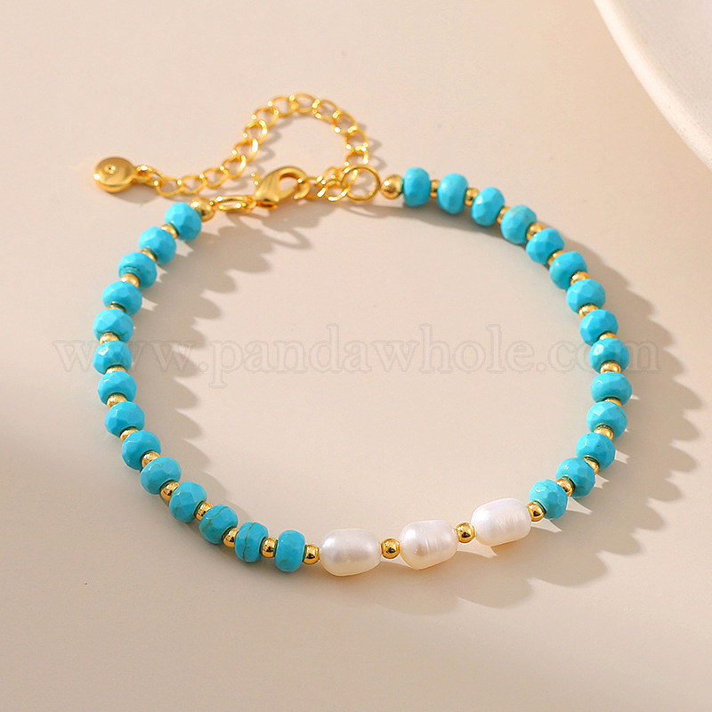 Браслет из бусин из натурального жемчуга и синтетической бирюзы, с золотой латуни цепи