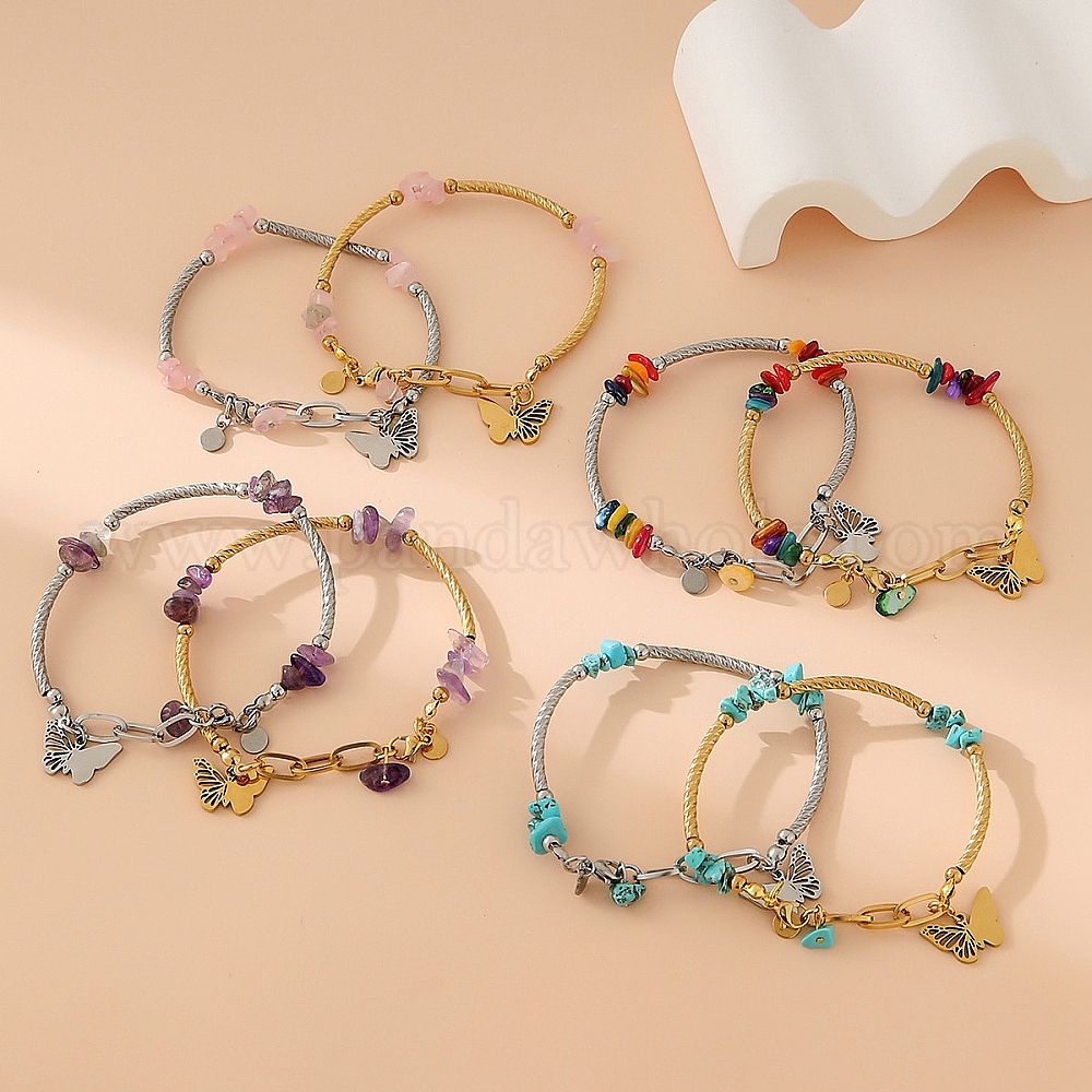 • Смешанные камни Браслеты из нержавеющей стали с бусинами для женщин, с подвеской, бабочка, 6-1/4 дюйм (16 см)