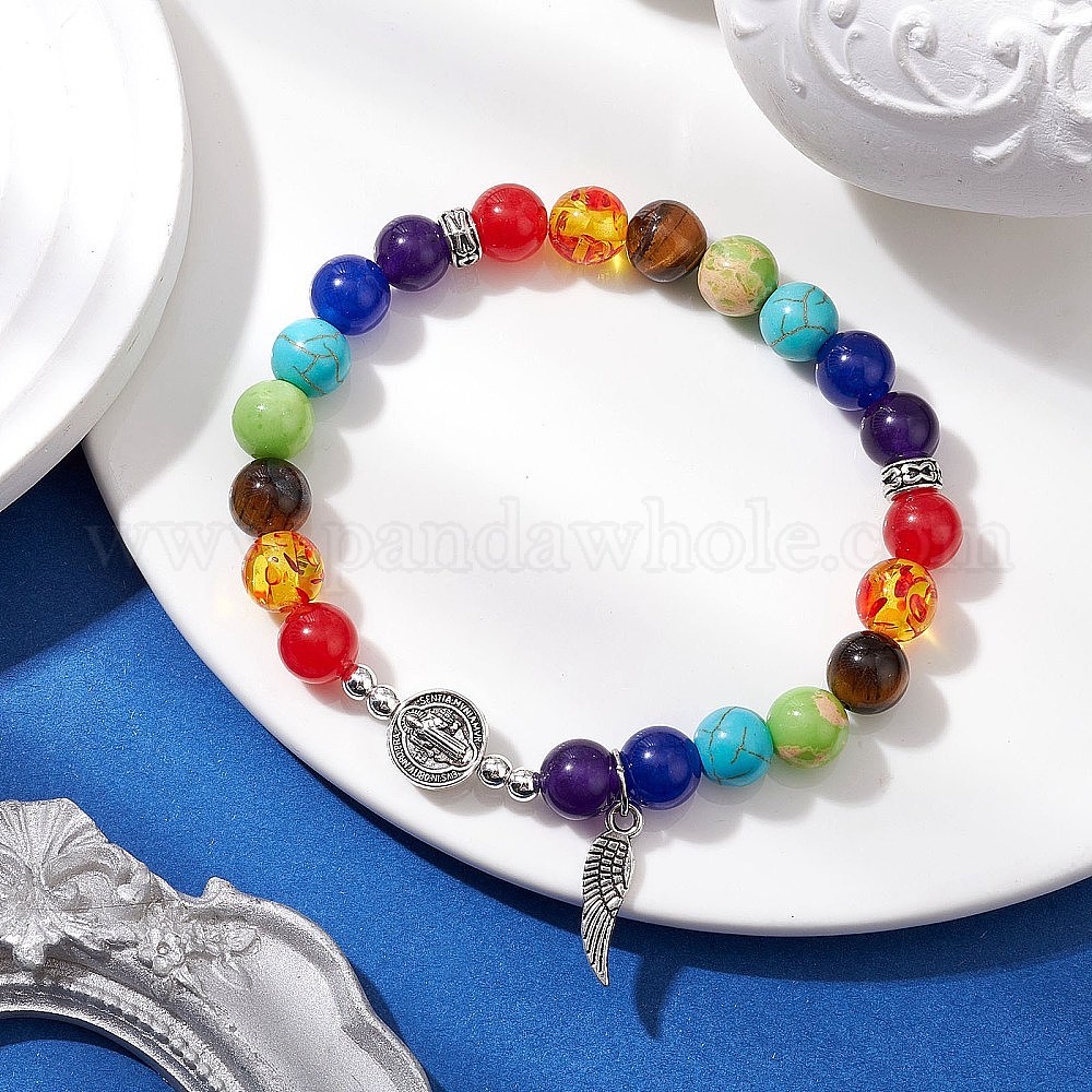 • (52) Непрозрачная лаванда Браслеты с бусинами из натуральных и синтетических смешанных драгоценных камней на тему чакры, ювелирные изделия из смоляных бусин и сплавов с подвесками для женщин, дева мария и форма пера, разноцветные, внутренний диаметр: 2-1/8 дюйм (5.5 см)