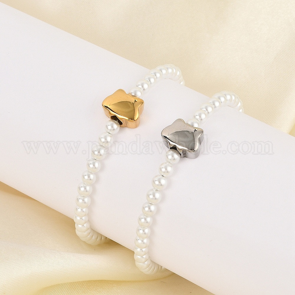 Пластиковые браслеты из искусственного жемчуга для женщин, кошка, с 304 фурнитурой из нержавеющей стали (02ZNX9)
