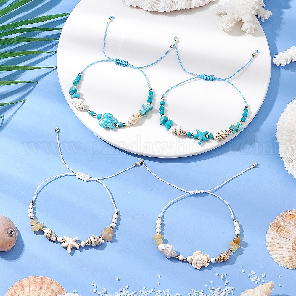 4шт 4 стили браслеты из ракушек и бусин, морская звезда и черепаха, с синтетическими бирюзовыми бусами