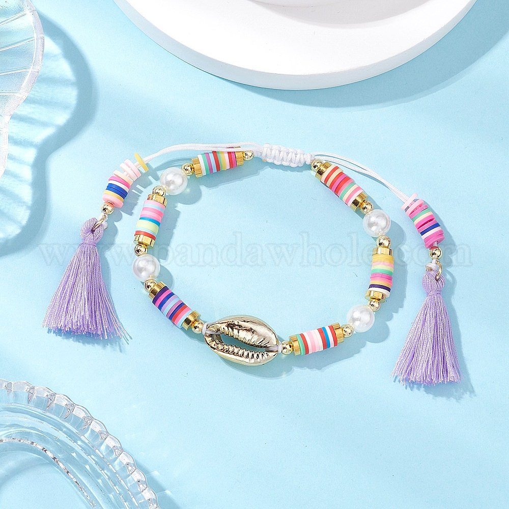 Плоские круглые браслеты из плетеных бусин из полимерной глины, АБС-пластик имитация жемчуга круглые бусины ювелирные изделия для женщин, с гальваническим покрытием из поликоттона, ракушечными бусинами и кисточками ручной работы