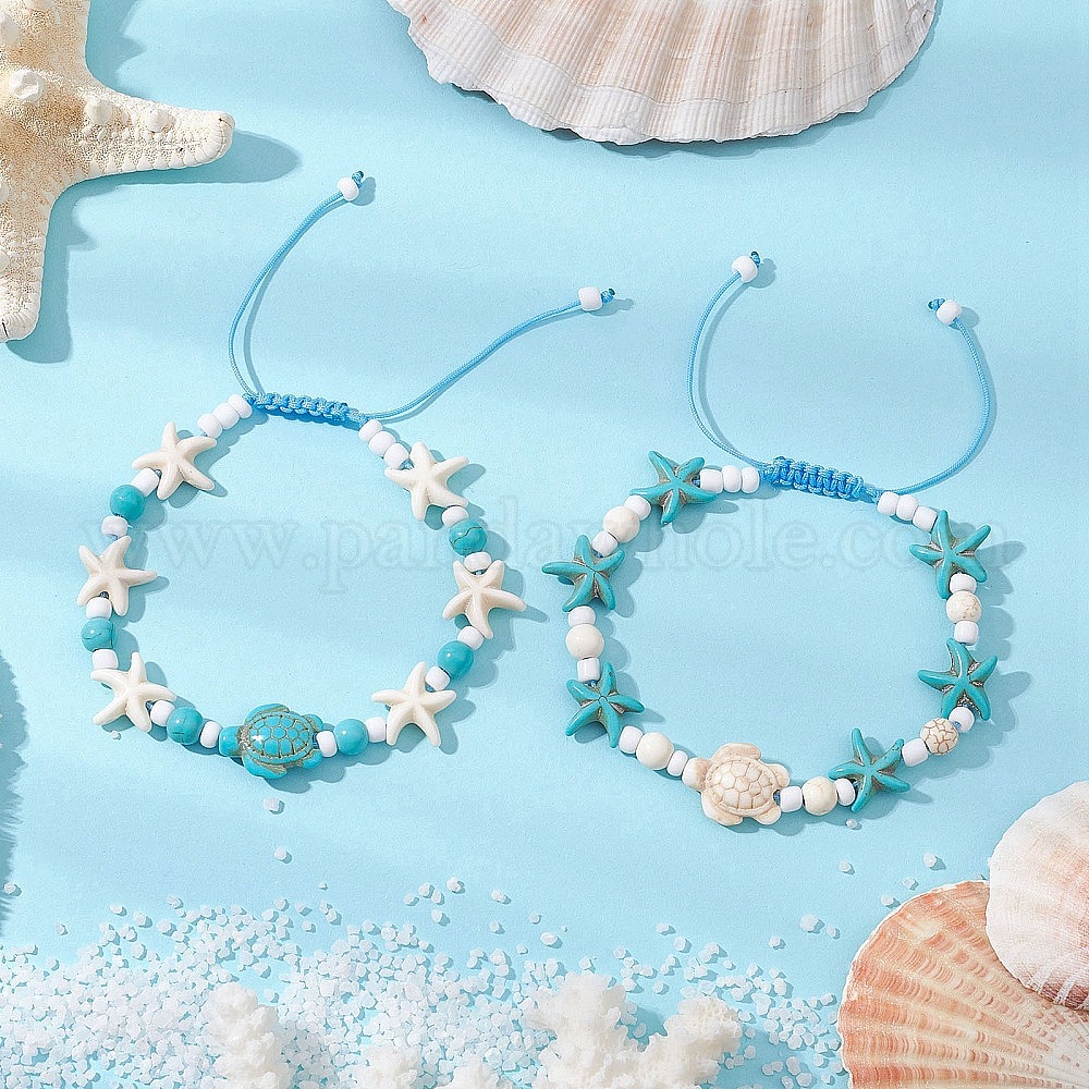 Плетеные браслеты из бусин из окрашенной синтетической бирюзы и магнезита для женщин, морская звезда и раковина, со стеклянными бисеринами