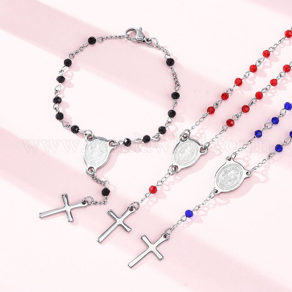 • Красный Браслеты из стеклянных бусин, 304 браслеты из нержавеющей стали с крестом и овалом и амулетами в виде святых, с 201 фурнитурой из нержавеющей стали, красные, 6-1/2 дюйм (16.5 см)