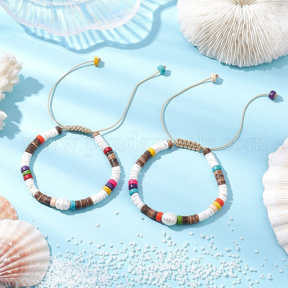 Регулируемые плетеные браслеты из синтетической бирюзы heishi, натуральной морской ракушки, кокоса и культивированного пресноводного жемчуга для женщин, плоско-круглые