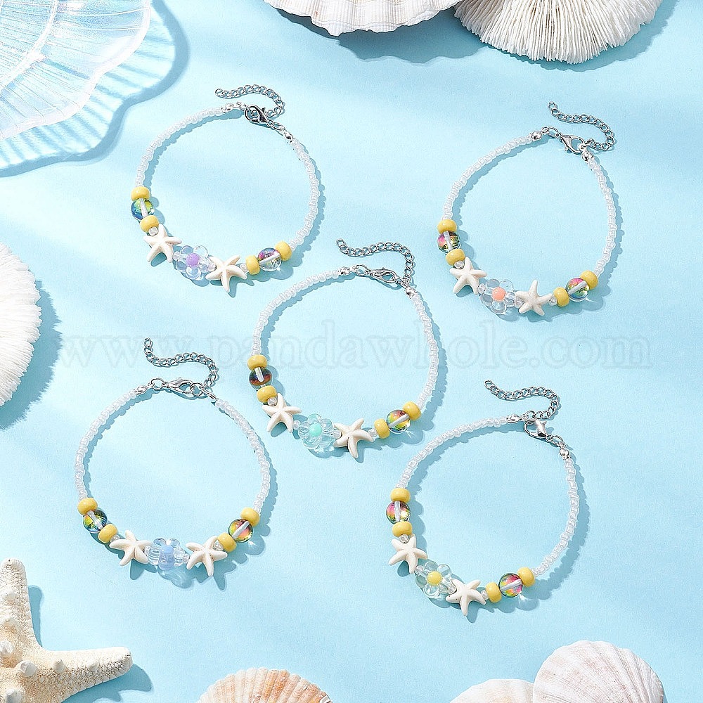 Браслеты из стеклянных бусин для женщин, с акриловыми бусинами и синтетическими бирюзовыми бусинами, морская звезда и цветок