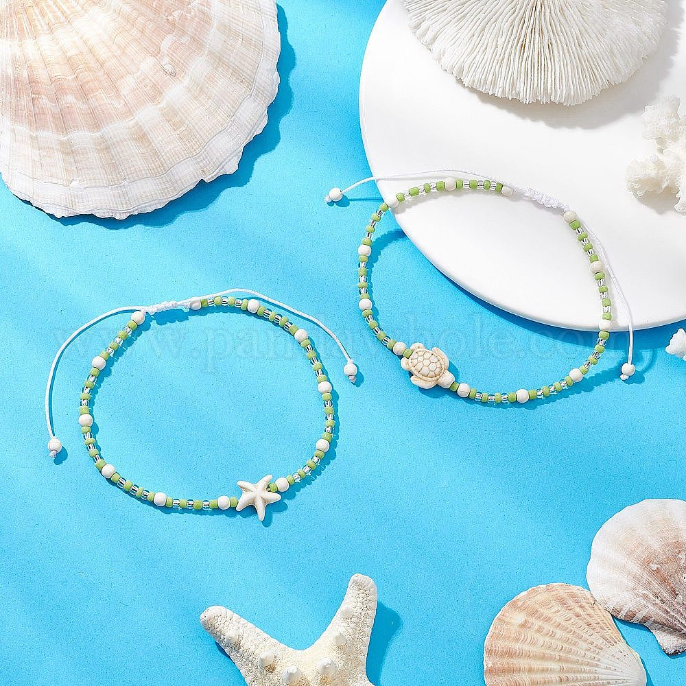 2шт. стеклянные семена регулируемые плетеные браслеты из бисера, с бирюзой синтетического, морская звезда и черепаха
