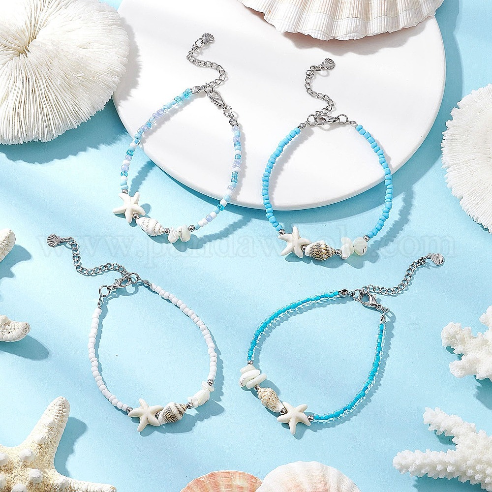 Браслеты из бисера, с бусинами из ракушек и синтетическими бусинами из магнезита, 304 концами из нержавеющей стали, застежками-лобстерами из цинкового сплава, железными наконечниками бусин, 316 подвесками из хирургической нержавеющей стали