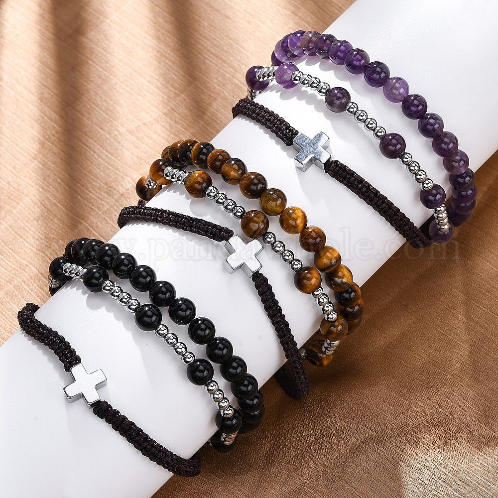 Регулируемые браслеты из плетеных бусин из натуральных драгоценных камней и гематита, с крестообразным сплавным шариком