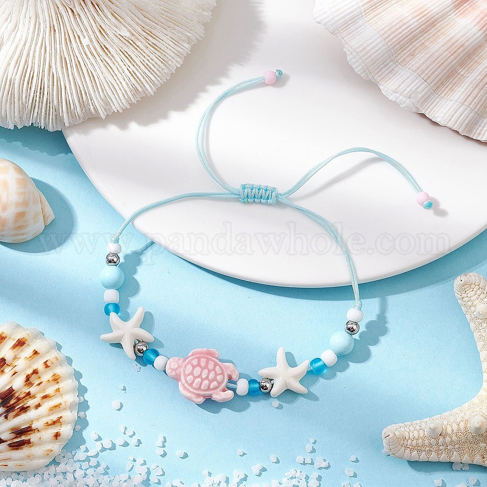 Синтетические бирюзовые бусины плетеные браслеты из бисера, черепаха и морская звезда, с фарфоровыми бусинами ручной работы
