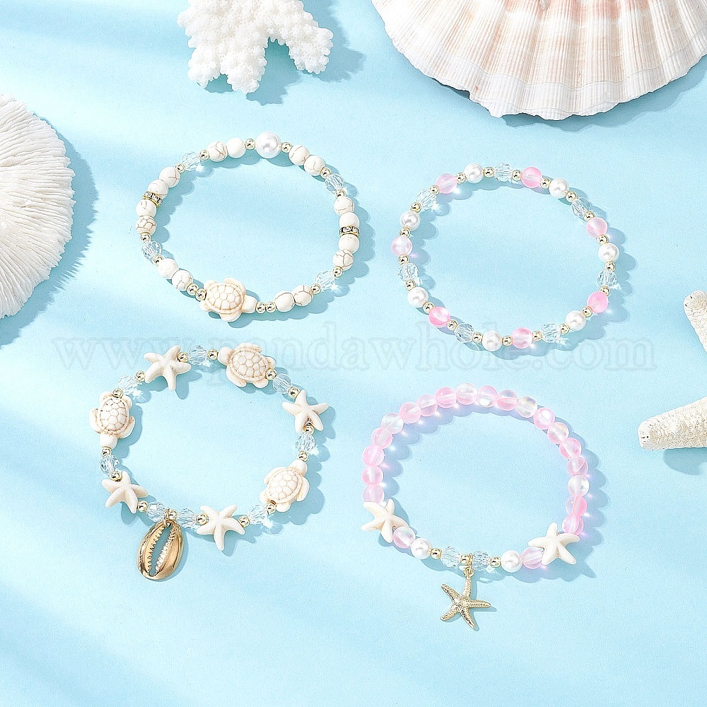 • Бледно-Розовый 4шт. 4 стили браслеты из ракушек, жемчуга, стекла, синтетической бирюзы и синтетического лунного камня, 304 браслеты с подвесками из нержавеющей стали для женщин, розовый жемчуг, внутренний диаметр: 1-3/4~2-1/8 дюйм (4.6~5.4 см)