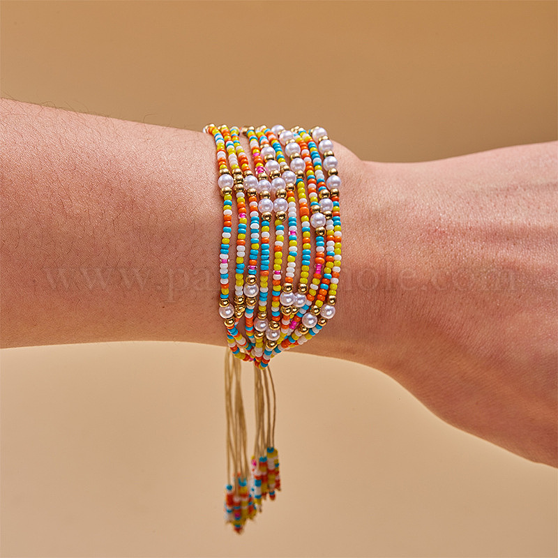 • Разноцветный Браслеты из плетеных бусин в богемном стиле, многожильные браслеты для женщин, с пластиковой жемчужины, красочный, 6-1/4~10-1/4 дюйм (16~26 см)
