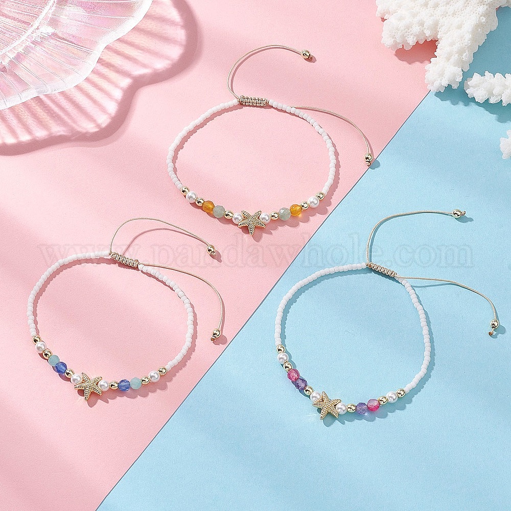 3шт. браслеты из плетеных бусин из натурального морского агата, амазонита и ракушек для женщин, с нейлоновой нитью и стеклом