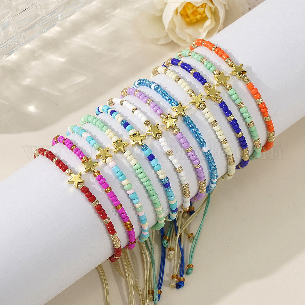 12шт. стеклянные бисерные браслеты регулируемой длины, латунь звезда шарм браслеты для женщин (039YN4)