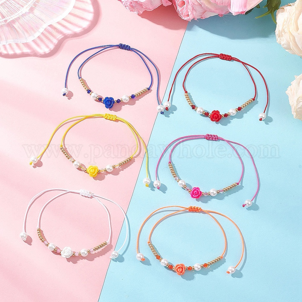 6 шт. браслеты из стеклянного бисера и плетеного бисера из смолы, плетеные браслеты из нейлоновой нити для женщин, цветок розы (03A1K8)