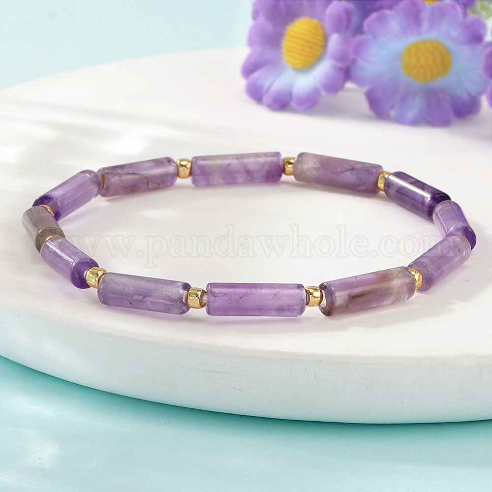 • Аметист Эластичные браслеты из натурального аметиста с колонновидными бусинами и латунными бусинами., золотые, 6.89 дюйм (17.5 см)