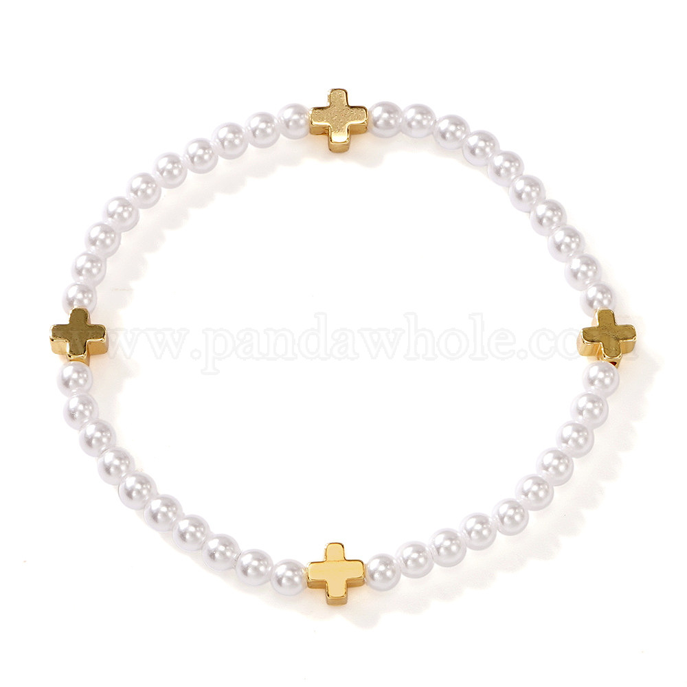 • Белый Летние латунные браслеты с крестом и круглыми бусинами из искусственного жемчуга для женщин., золотые, белые, 6.89 дюйм (17.5 см)