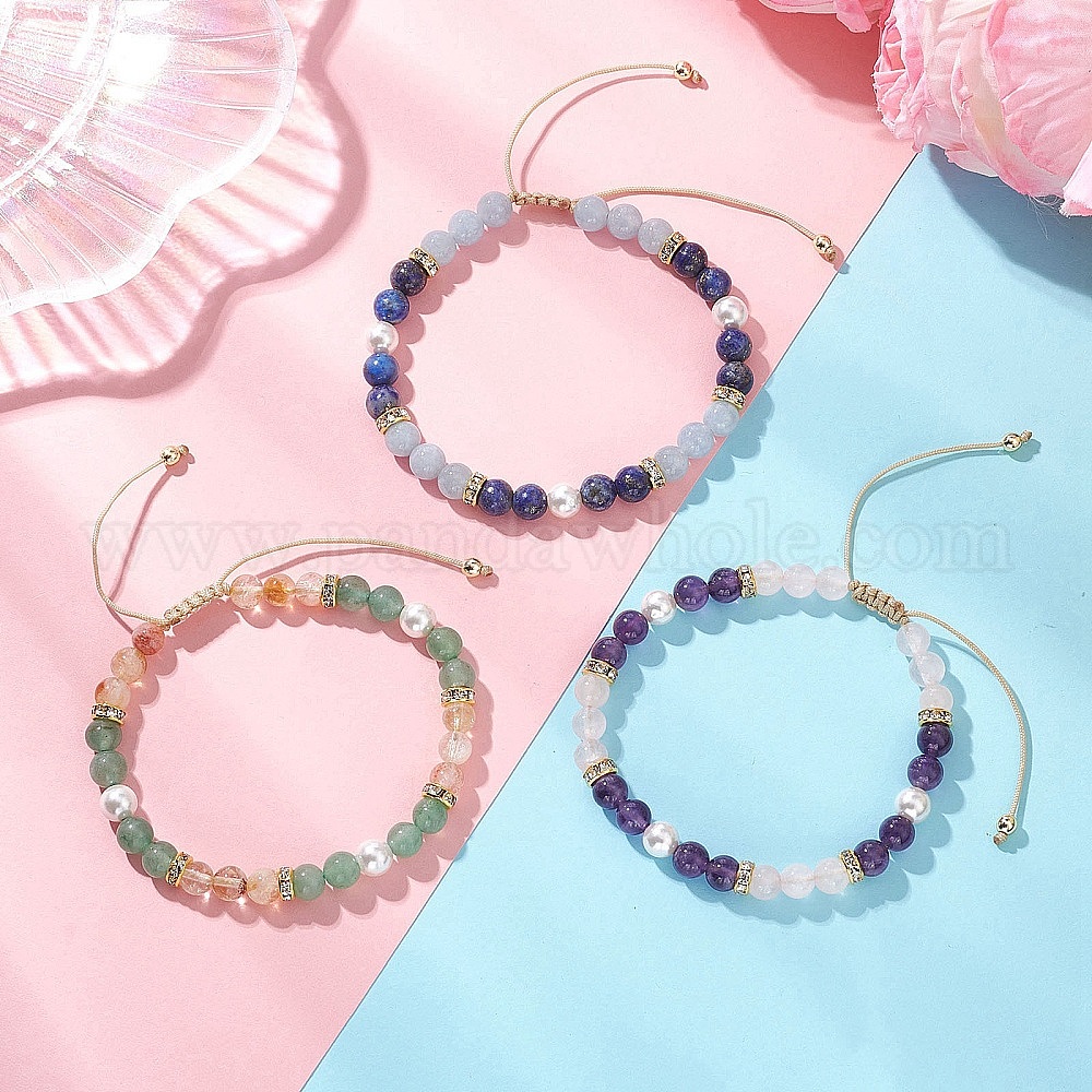 3 шт. браслеты из круглых бусин из натуральных смешанных драгоценных камней и жемчуга из ракушек, плетеные из бусин., плетеные браслеты из нейлоновой нити для женщин, с Гальваническим немагнитных синтетическими гематита бисера