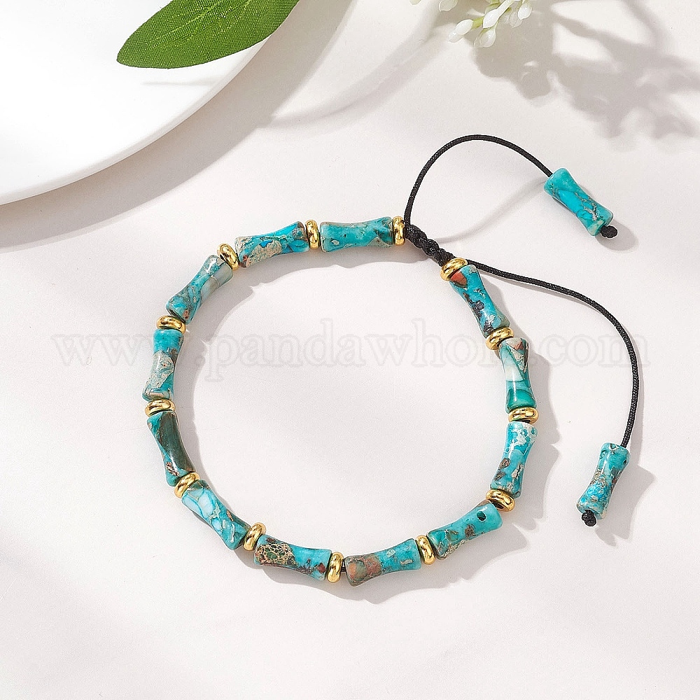 • Средний Бирюзовый Браслеты из плетеных бусин, окрашенных натуральными красителями, императорской яшмы и латуни., Браслеты из плетеного нейлонового шнура для женщин и мужчин, бамбук, средне бирюзовый, внутренний диаметр: 2.22~3.17 дюйм (5.65~8.05 см)