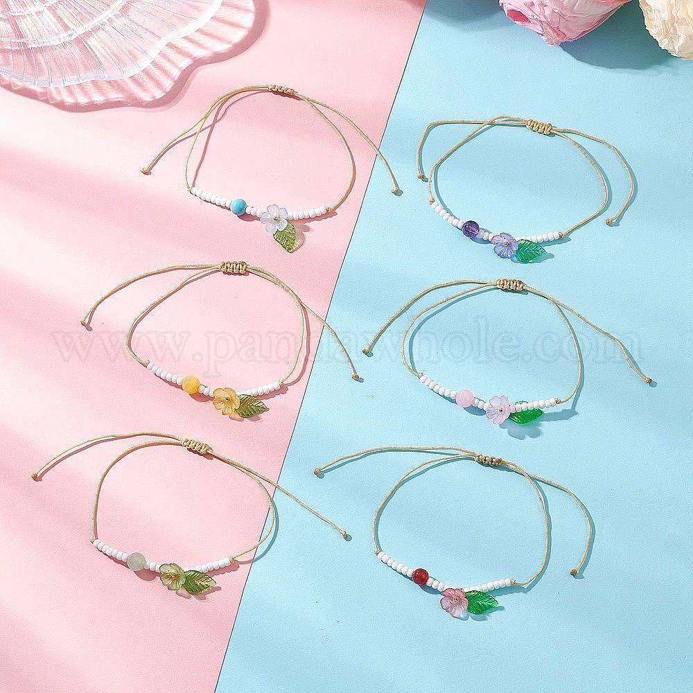 6 Браслеты из натуральных аметистов, карнеола, окрашенного желтого нефрита, зеленого авантюрина, синтетической зеленой бирюзы и стеклянного бисера с цветочным и листовым орнаментом, регулируемые плетеные браслеты шнур (03ACFJ)
