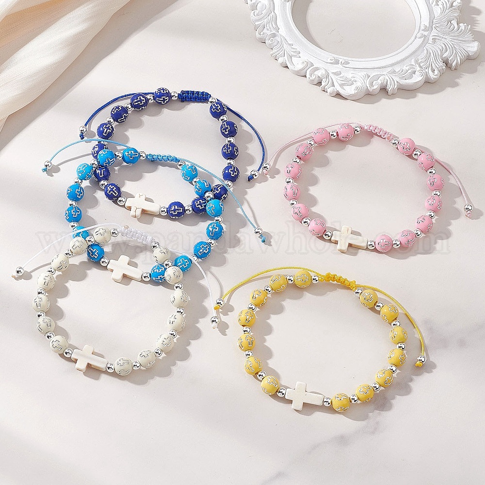 Регулируемые браслеты из акрила, синтетической бирюзы и немагнитного гематита, плетеные из бусин, для женщин., круглый с крестом и крестом