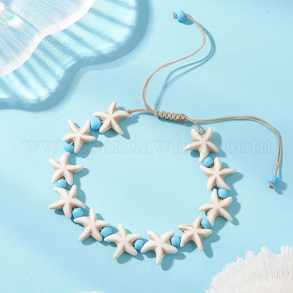 Регулируемые браслеты из синтетических бирюзовых бусин в форме морской звезды, плетеные из бусин, для женщин., со стеклянными бисеринами (03ATBM)