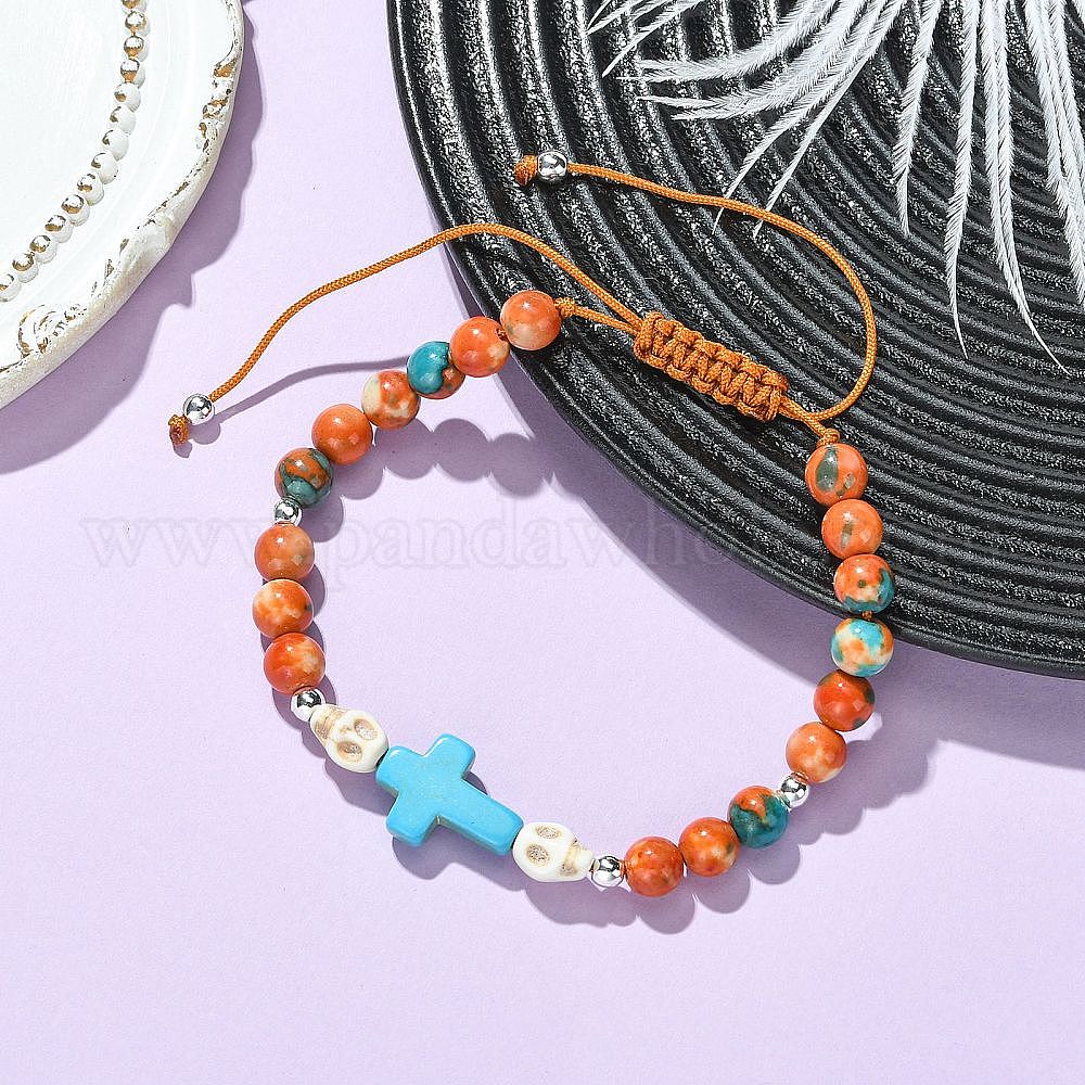 • Синтетический Камень Регулируемые браслеты из синтетических бирюзовых и белоснежных нефритовых бусин, Браслеты из плетеной нейлоновой веревки для женщин и мужчин, крест и череп, С немагнитным синтетическим гематитом, внутренний диаметр: 1.95~3.84 дюйм (4.95~9.75 см)