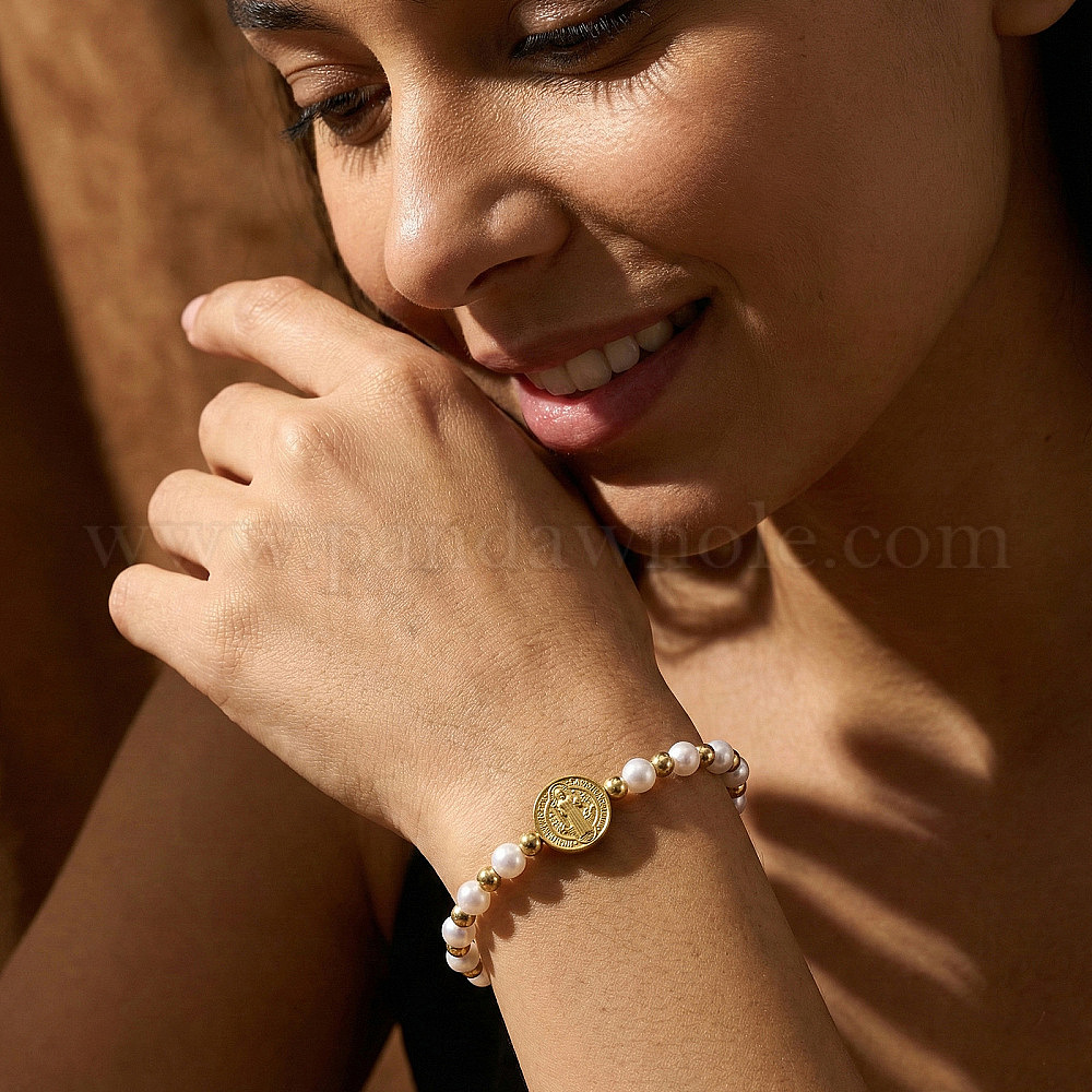 • Золотой Элегантные круглые латунные браслеты из плетеных бусин с искусственным жемчугом, регулируемые женские браслеты из нейлоновой нити, плоские круглые с святым Бенедиктом, золотые, 11.02 дюйм (28 см)