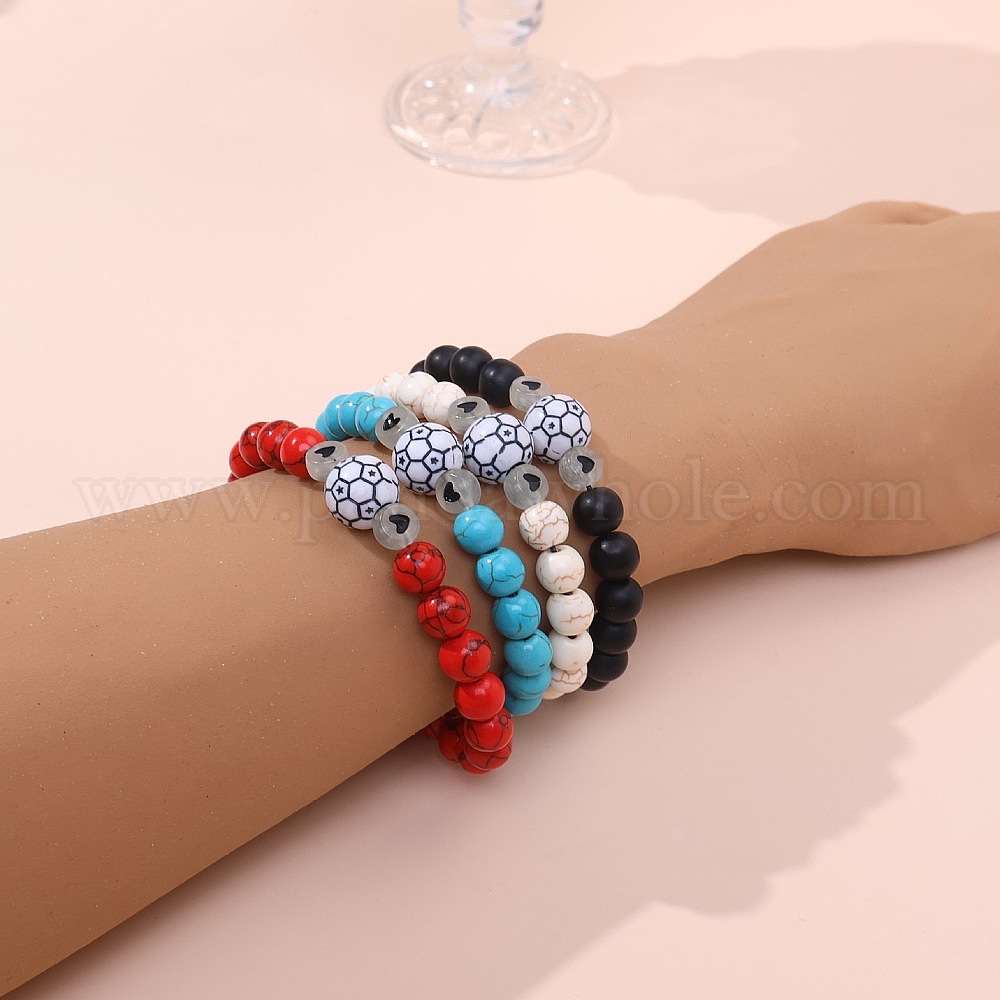 Спортивные браслеты из синтетических и натуральных драгоценных камней, а также пластиковых бусин, плетеные браслеты из бусин, Регулируемые браслеты из плетеной нейлоновой нити для женщин и мужчин, сияющий футбол и сердце (03BCPX)