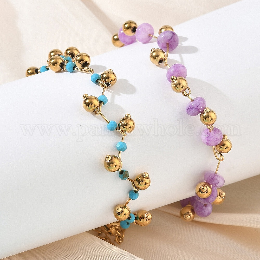 • Синтетическая Бирюза 304 Браслеты из граненых круглых бусин из синтетической бирюзы из нержавеющей стали, золотые, 6.89 дюйм (17.5 см)