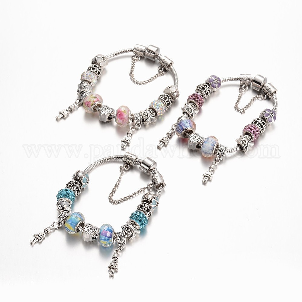 Сплав горный хрусталь шарик европейские браслеты, со стеклянными шариками и цепи латуни, 190 мм