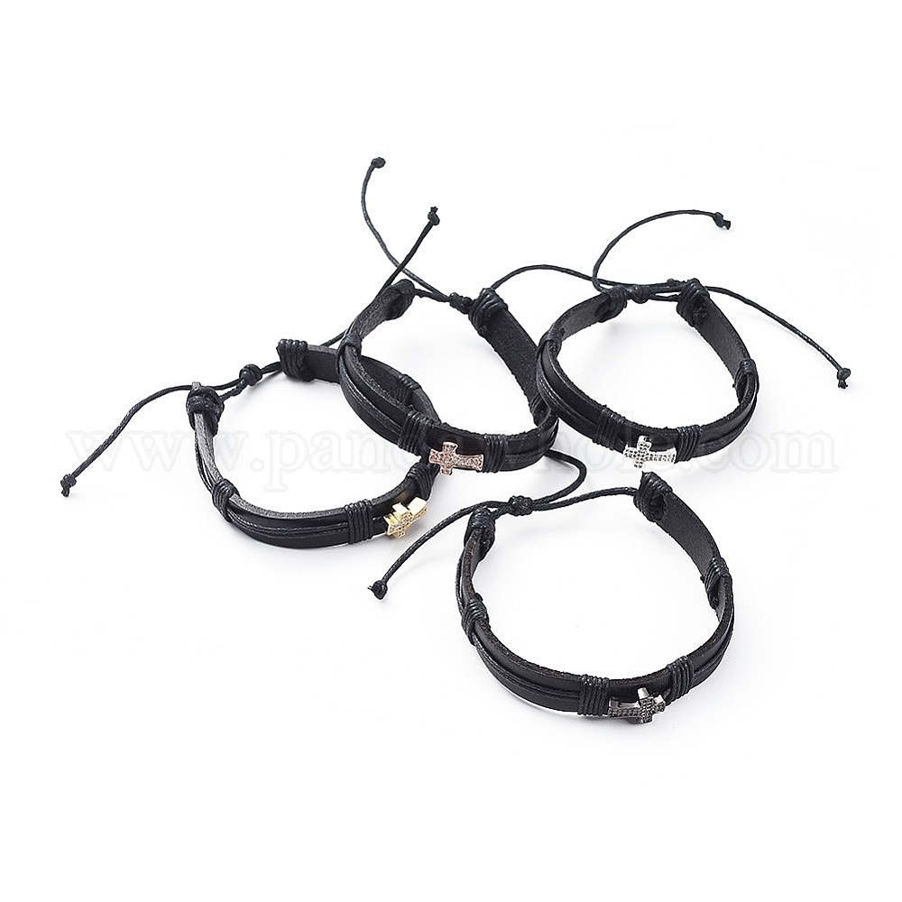 Браслеты с регулируемым шнуром унисекс, с коровьей кожаный шнур, вощеный шнур и латунные бусины из циркония, крестик (00Z9WD)