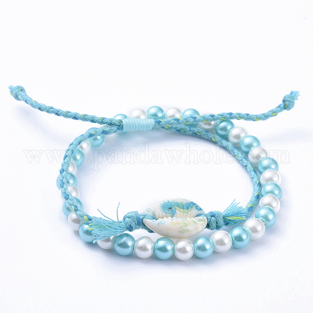Регулируемые плетеные браслеты из бусин и наборы эластичных браслетов, с набивными бусинами из ракушек каури, Стеклянные жемчужные бусины, хлопковый шнур и нейлоновая нить