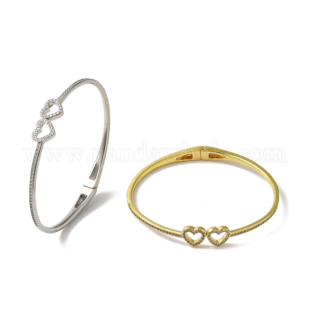 Полые двойные браслеты с сердечками из полой латуни с микропаве из прозрачного кубического циркония, без свинца и без кадмия, долговечный