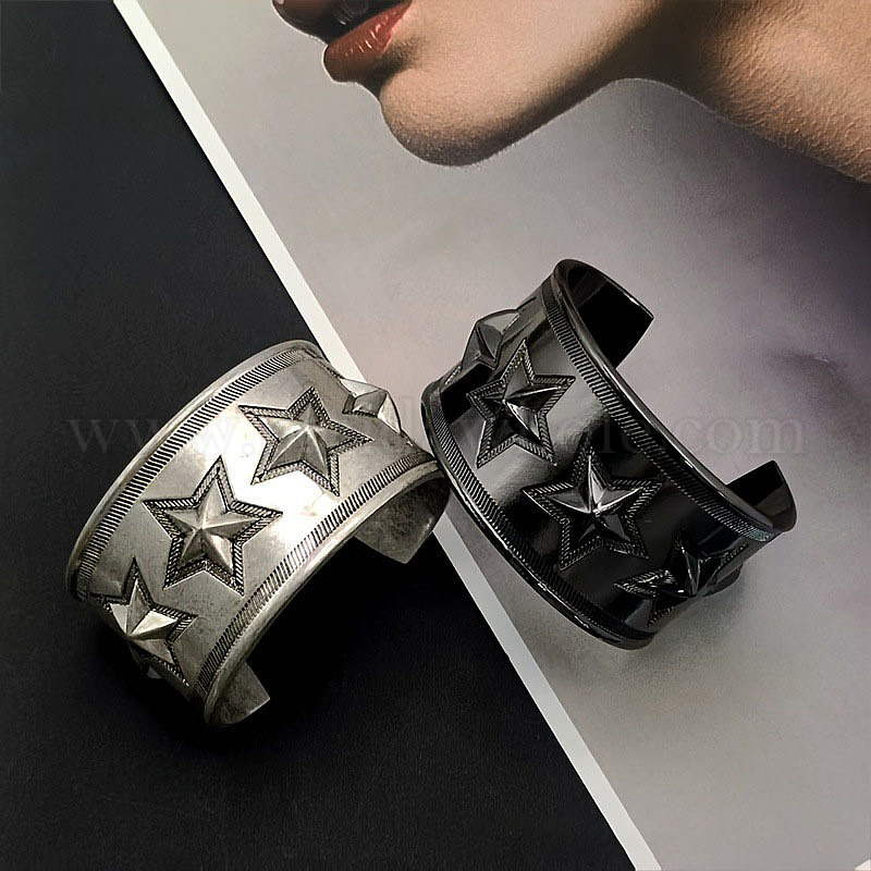 • Античное Серебро Ретро-браслеты-манжеты из латуни для женщин, звезда, античное серебро, 1-1/2 дюйм (3.7 см), внутренний диаметр: 2-1/2 дюйм (6.5 см)