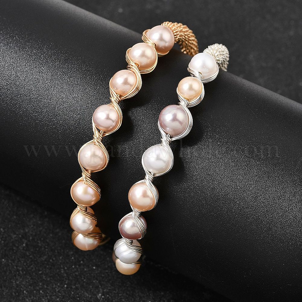 Браслеты-манжеты для женщин, обмотанные латунной проволокой и украшенные натуральным жемчугом., круглые, стойки покрытие, долговечный (03AXEQ)
