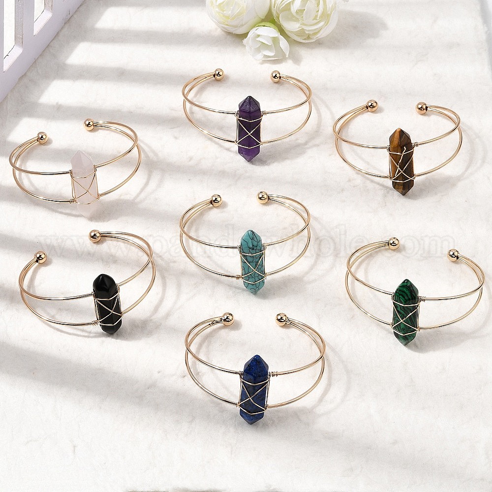 Браслеты-манжеты для женщин из латуни с шестиугольными наконечниками, обмотанными натуральными и синтетическими драгоценными камнями.