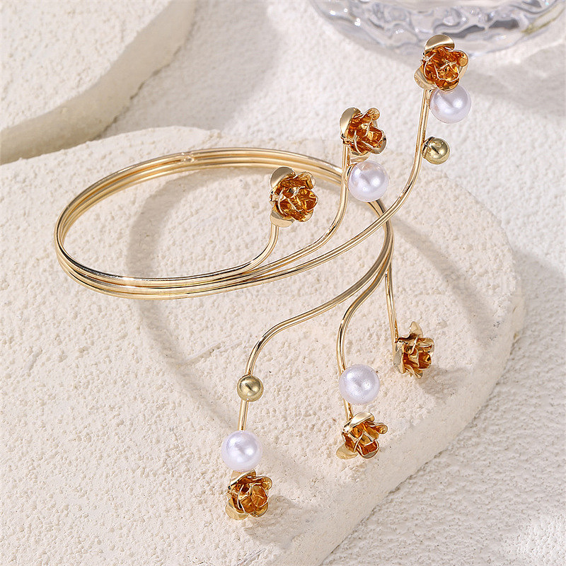 • Золотой Браслеты-манжеты из сплава и искусственного жемчуга, браслеты на предплечье для женщин, цветок розы, золотые, внутренний диаметр: 2.56 дюйм (6.5 см)