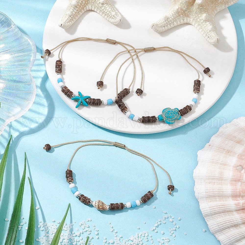 3 шт. 3 стили летние пляжные звездочки черепаха панцирь регулируемые браслеты для щиколотки, браслеты на ногу из окрашенной синтетической бирюзы, ракушек и кокоса