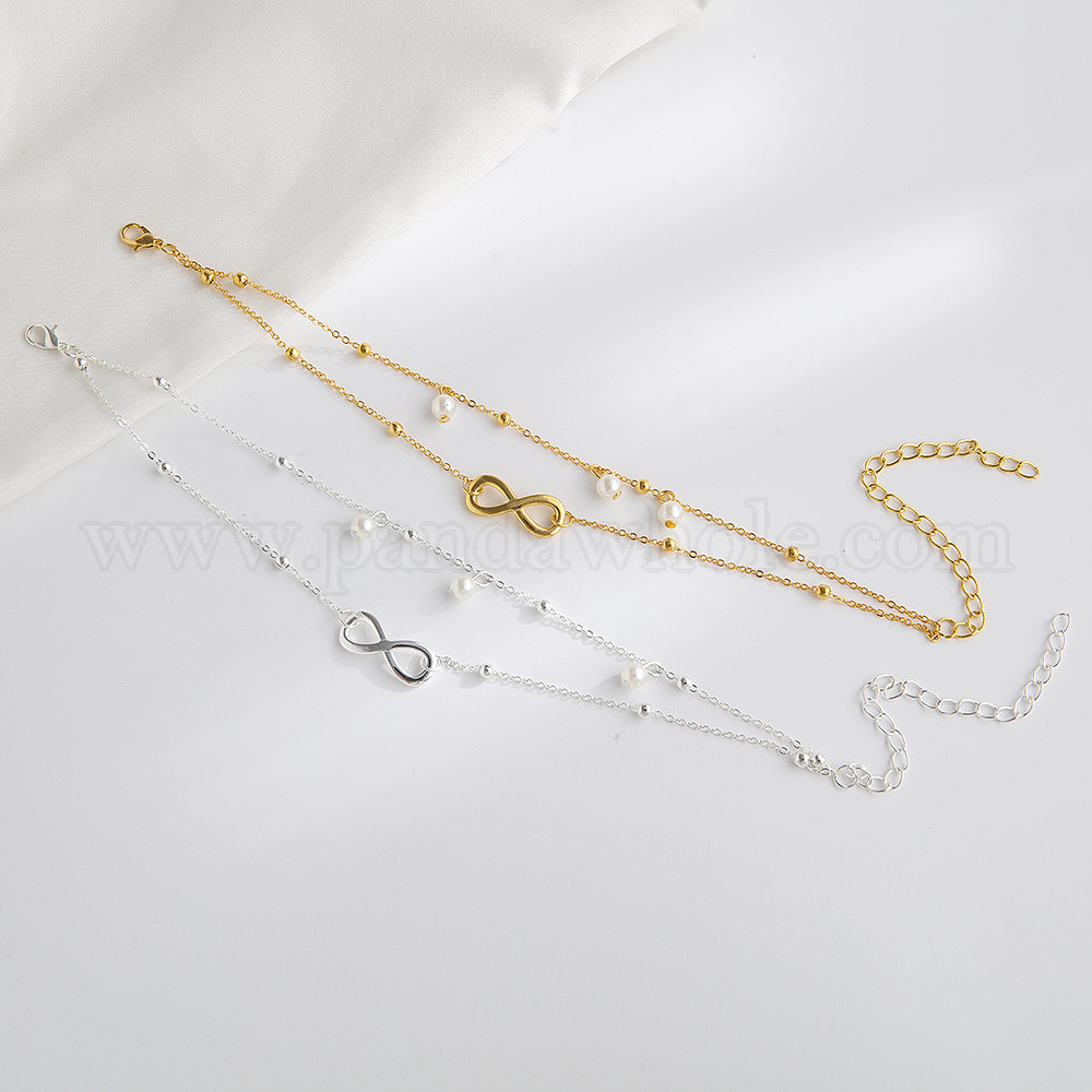 Двухслойные браслеты на ногу из сплава Infinity Link, с пластиковой имитацией жемчуга