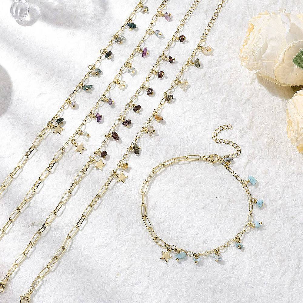Браслеты на ногу из натурального ларимара/мохового агата/флюорита/рутилового кварца/гранатовой крошки с подвесками из латуни и цепочкой Фигаро, с 304 звездами из нержавеющей стали (032FN1)