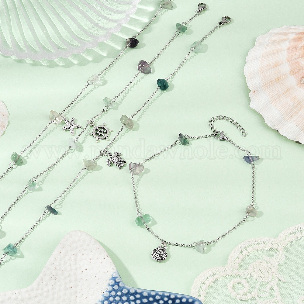 • Mixed Shapes Браслеты на ногу с цепочкой из натурального флюорита, браслеты на ногу из сплава океана в тибетском стиле, античное серебро, разнообразные, 9-7/8 дюйм (250 мм), Кулон : 12.5~18.5x9.5~13.5 мм