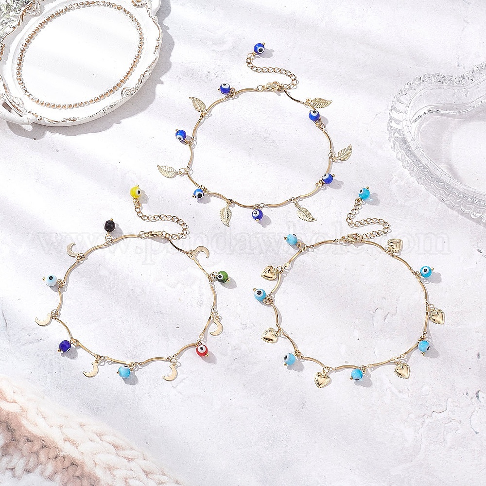 • (52) Непрозрачная лаванда 3 шт. 3 стили ручной работы, лэмпворк от сглаза и кисточка из нержавеющей стали в форме луны, сердца и листьев 304 браслеты на ногу из изогнутой цепочки из нержавеющей стали для женщин, золотые, разноцветные, 9-5/8 дюйм (244 мм), 1 шт / стиль