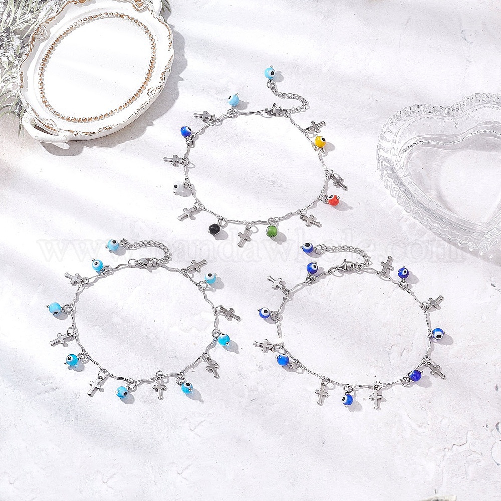 3 шт. 3 цвета ручной работы, лэмпворк с эффектом сглаза и 304 браслеты на ногу из нержавеющей стали с крестообразными звеньями и кисточками для женщин, цвет нержавеющей стали