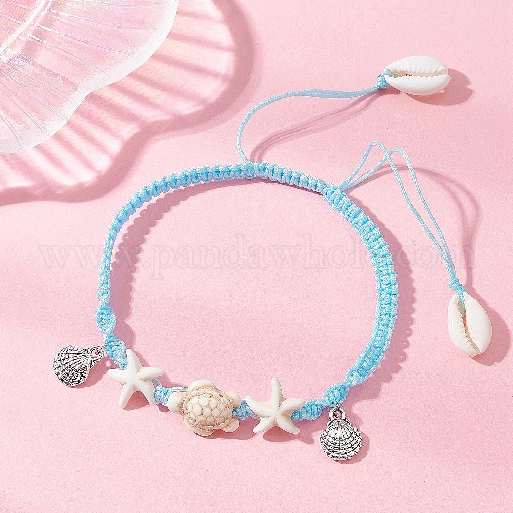Регулируемые летние пляжные браслеты на лодыжку из синтетических бусин бирюзового цвета, окрашенные в цвет морской звезды или черепахи., с подвесками в форме натуральных раковин каури и раковин из сплава.