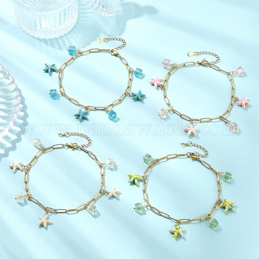 Браслеты на лодыжку из окрашенных синтетических бирюзовых бусин для женщин, морская звезда и куб, 304 Цепочки из нержавеющей стали и стекло