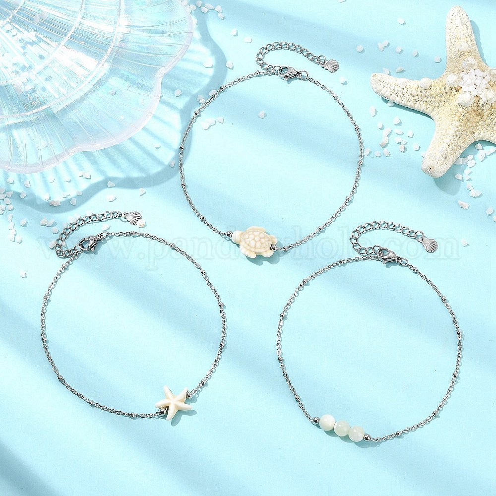 • Нержавеющая Сталь Цвет 3шт. 3 стили: браслеты на лодыжку из синтетической ткани, окрашенной в морской цвет, в виде морской звезды и круглой белой ракушки., 304 женские украшения из нержавеющей стали, цветочный белый, цвет нержавеющей стали, 9~9-1/8 дюйм (228~230 мм), 1 шт / стиль