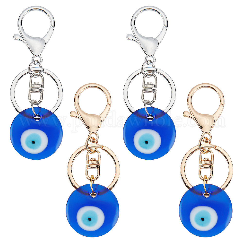 4шт 2цвета брелок ручной работы лэмпворк сглаз, с кольцами для ключей из сплава, плоско-круглые, синие (028JQZ)